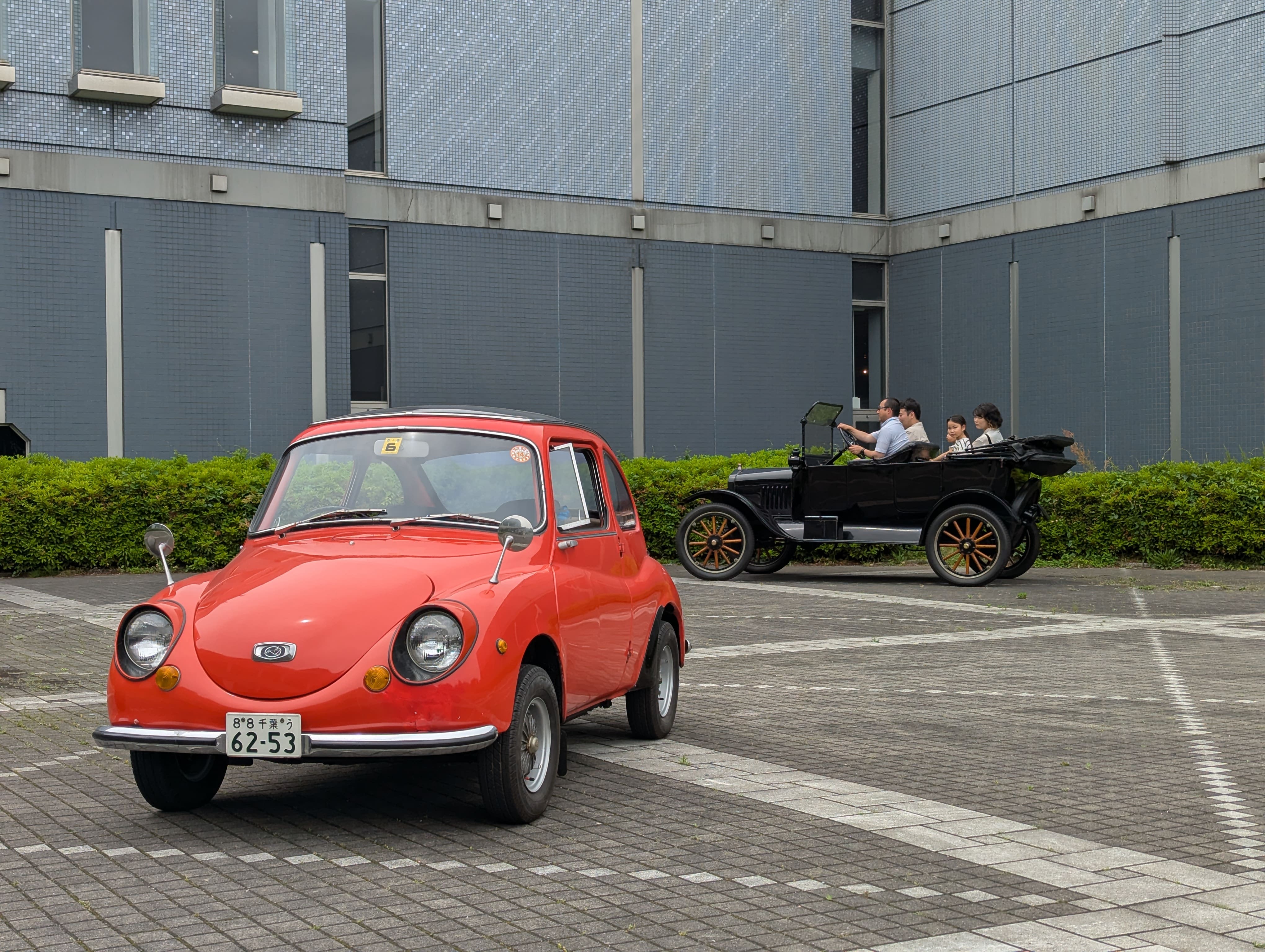 乗車会には、お子さんたちだけではなく、大人の方々も参加し、風を切って走る約100年前に製造された車の乗り心地を、楽しんでいました。また、あわせてスバル360も展示し、「てんとう虫」の愛称をもつ可愛らしい車の周りをT型フォードが走る様子を写真におさめる参加者の方も多くいました。