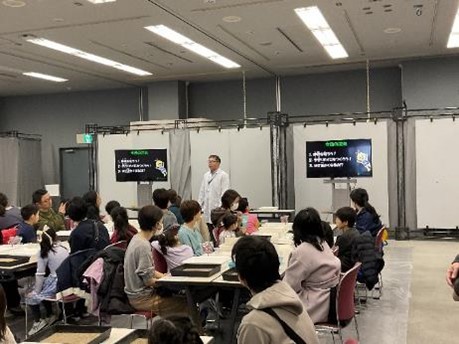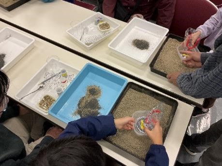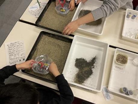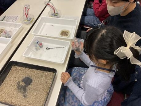 「風と遊べる凧をつくろう」、「きらきらミラーキューブをつくろう」、「LEDミニライトをつくろう」、「手作りカイロをつくろう」等の様々な工作を通して、科学に親しみ、わくわくするような体験教室を行っております。今年度初めての工作となる「手作りカイロをつくろう」では、強力な磁石を使っての砂鉄集めに参加者の皆さまは興味深々でした。材料を混ぜ合わせて、カイロの仕組みを楽しく学習しました。