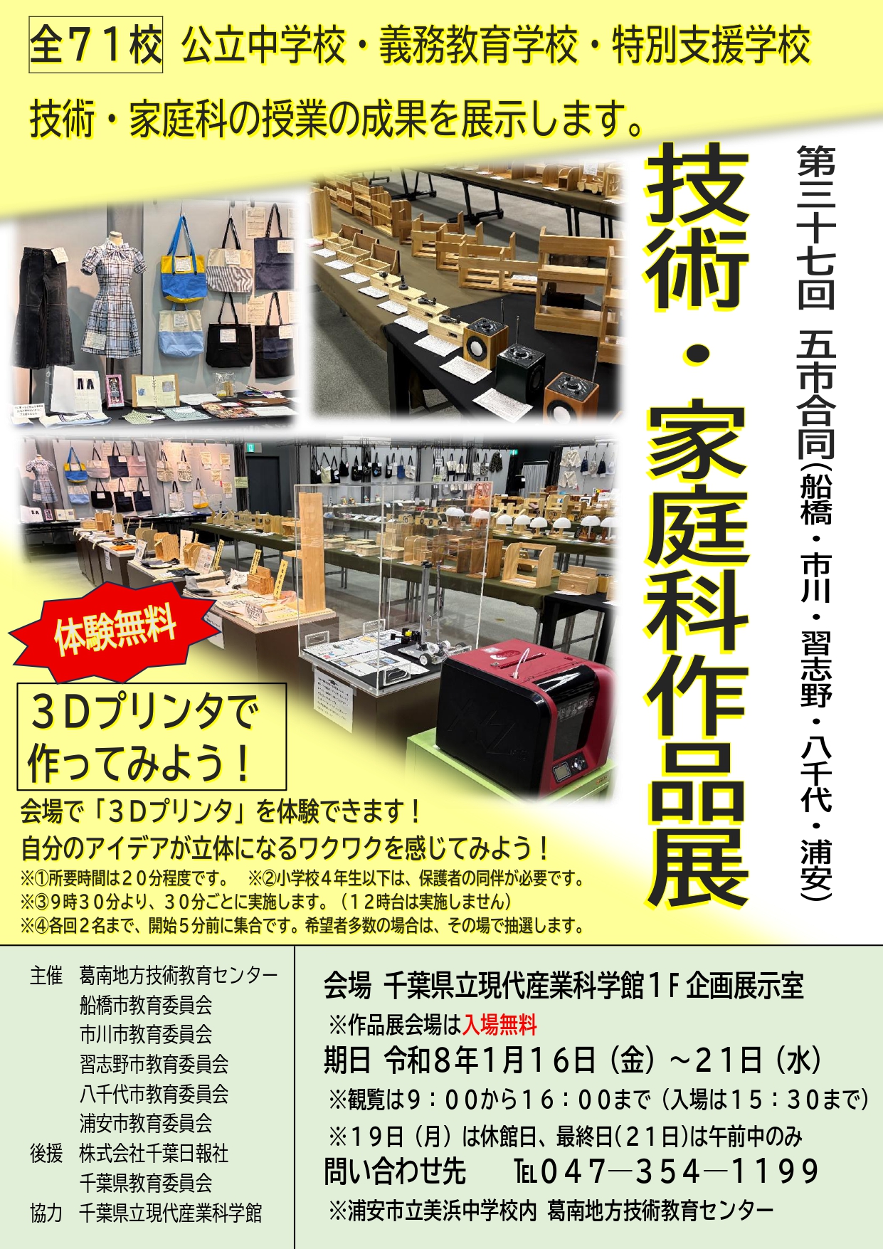 船橋市・市川市・習志野市・八千代市・浦安市の中学生による技術・家庭科の作品展示です。 「3Dプリンタ」体験があります。(所要時間20分程度 9時30分より30分ごとに各回2名まで 12:00~13:00は、体験を実施しません、) |