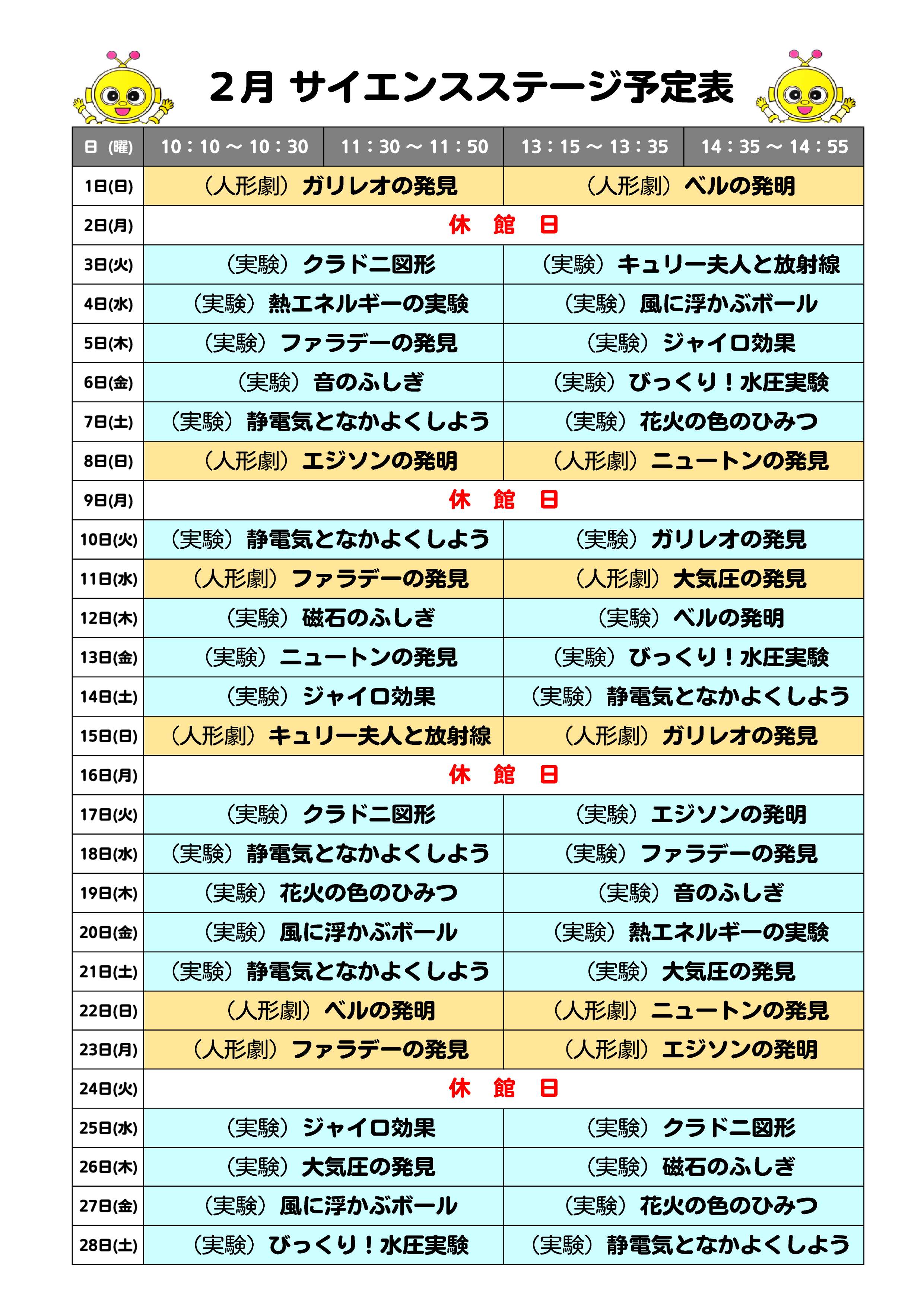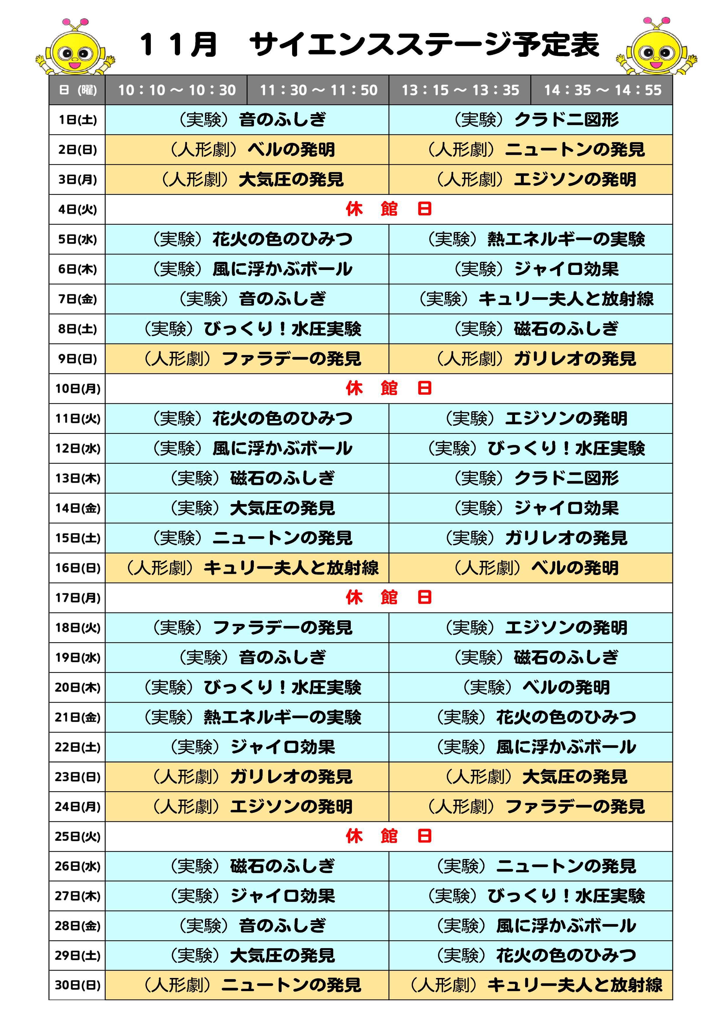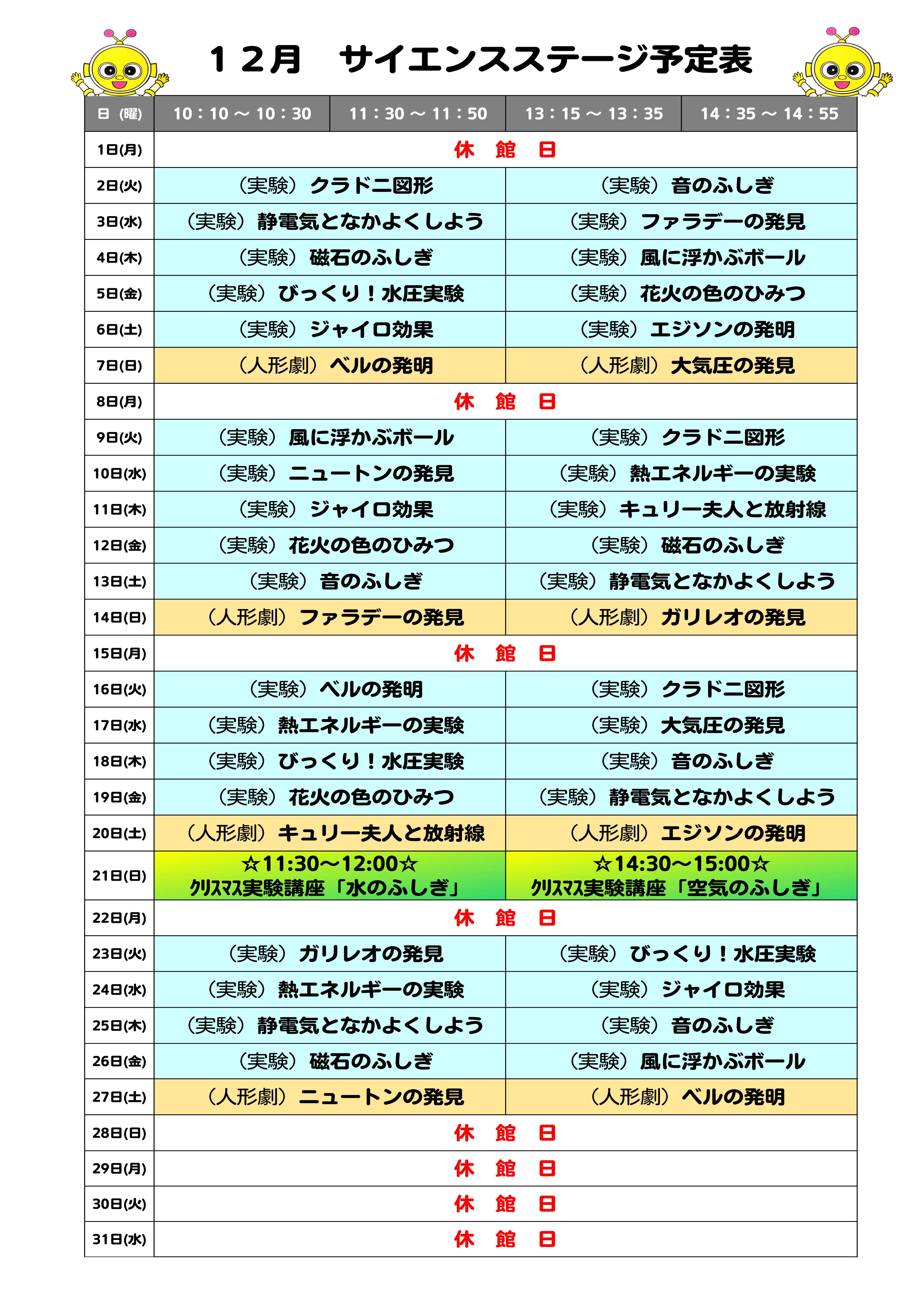 日曜・祝日を中心に、世界を変えた科学的な発明や発見を、実験とエピソードを交えて楽しく演じる「人形劇」を行います。