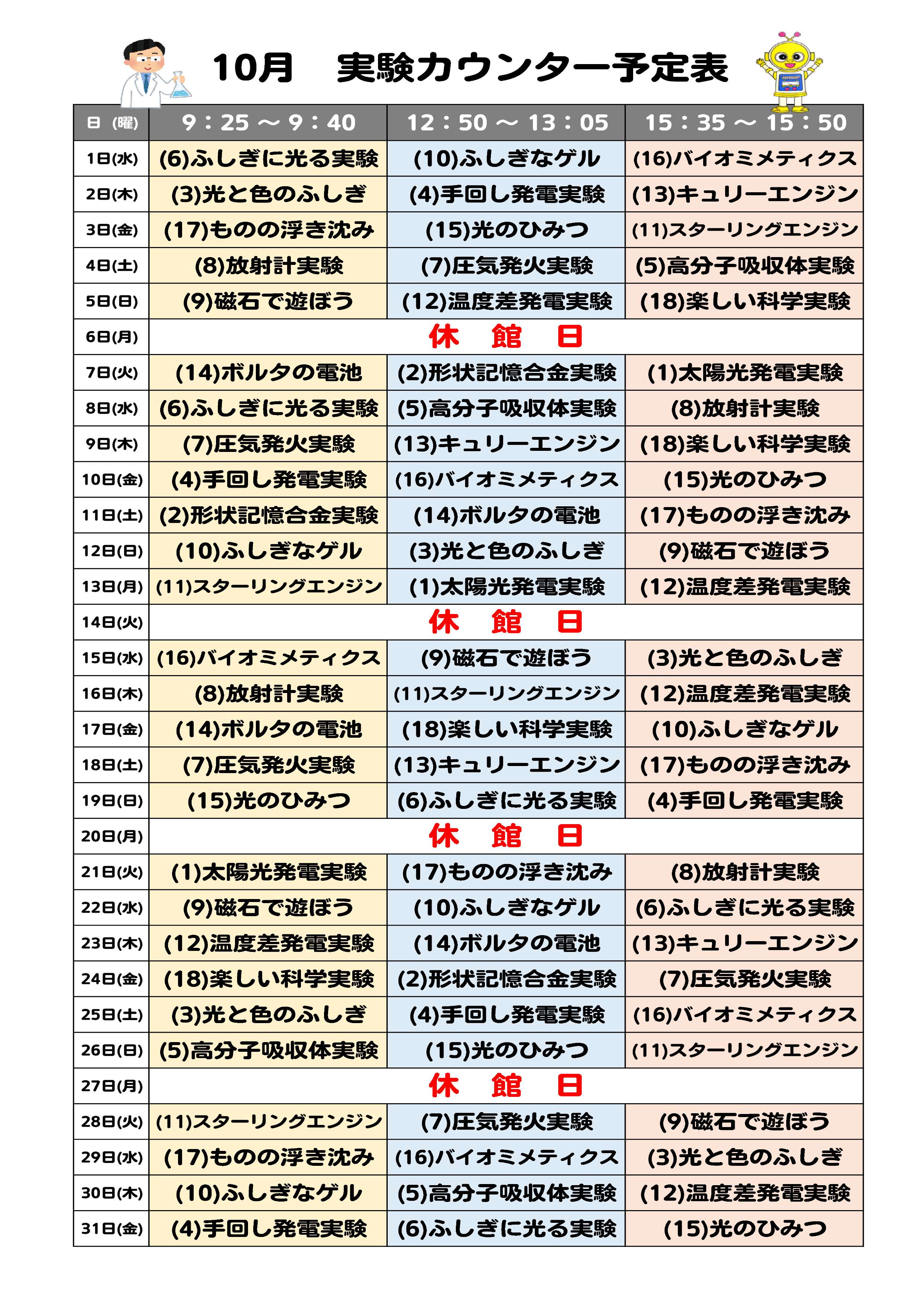 1日3回、実験カウンターでの実験を実施します。 実験カウンターでは、様々な科学実験を目の前で見ることができます。さらに、実際に体験できる実験も用意しております。 実験カウンター予定表 9月←クリックしてご確認ください 10月←クリックしてご確認ください 都合により、演目が変更になる場合があります。 上演開始時間 【15分/回】 (1)9:25~9:40 (2)12:50~13:05 (3)15:35~15:50 都合により、上演時間が変更になる場合があります。 混雑時はご覧いただけない場合もございます。 実験演目一覧 実験演目一覧←クリックしてご確認ください。