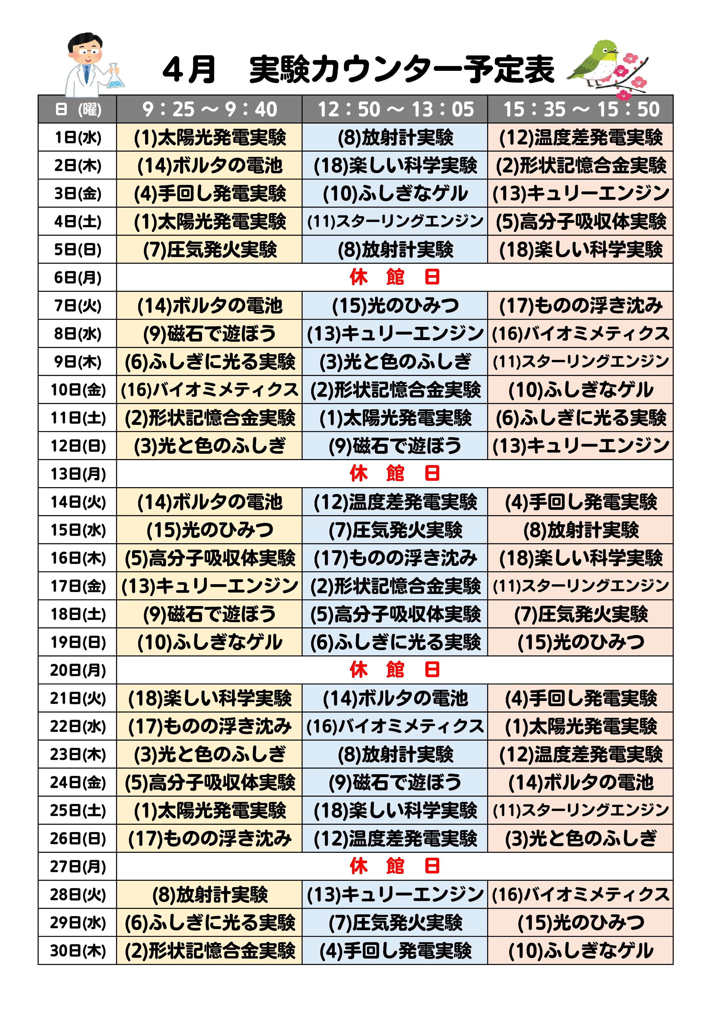 1日3回、実験カウンターでの実験を実施します。 実験カウンターでは、様々な科学実験を目の前で見ることができます。さらに、実際に体験できる実験も用意しております。 実験カウンター予定表 3月←クリックしてご確認ください 4月←クリックしてご確認ください 都合により、演目が変更になる場合があります。 上演開始時間 【15分/回】 (1)9:25~9:40 (2)12:50~13:05 (3)15:35~15:50 都合により、上演時間が変更になる場合があります。 混雑時はご覧いただけない場合もございます。 実験演目一覧 実験演目一覧←クリックしてご確認ください。