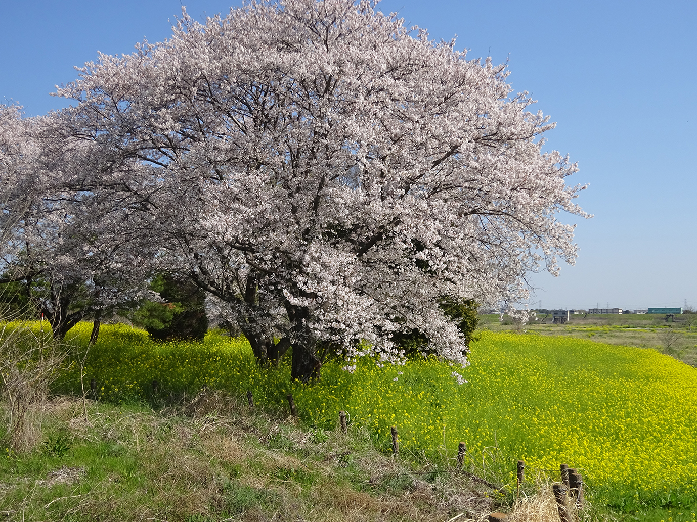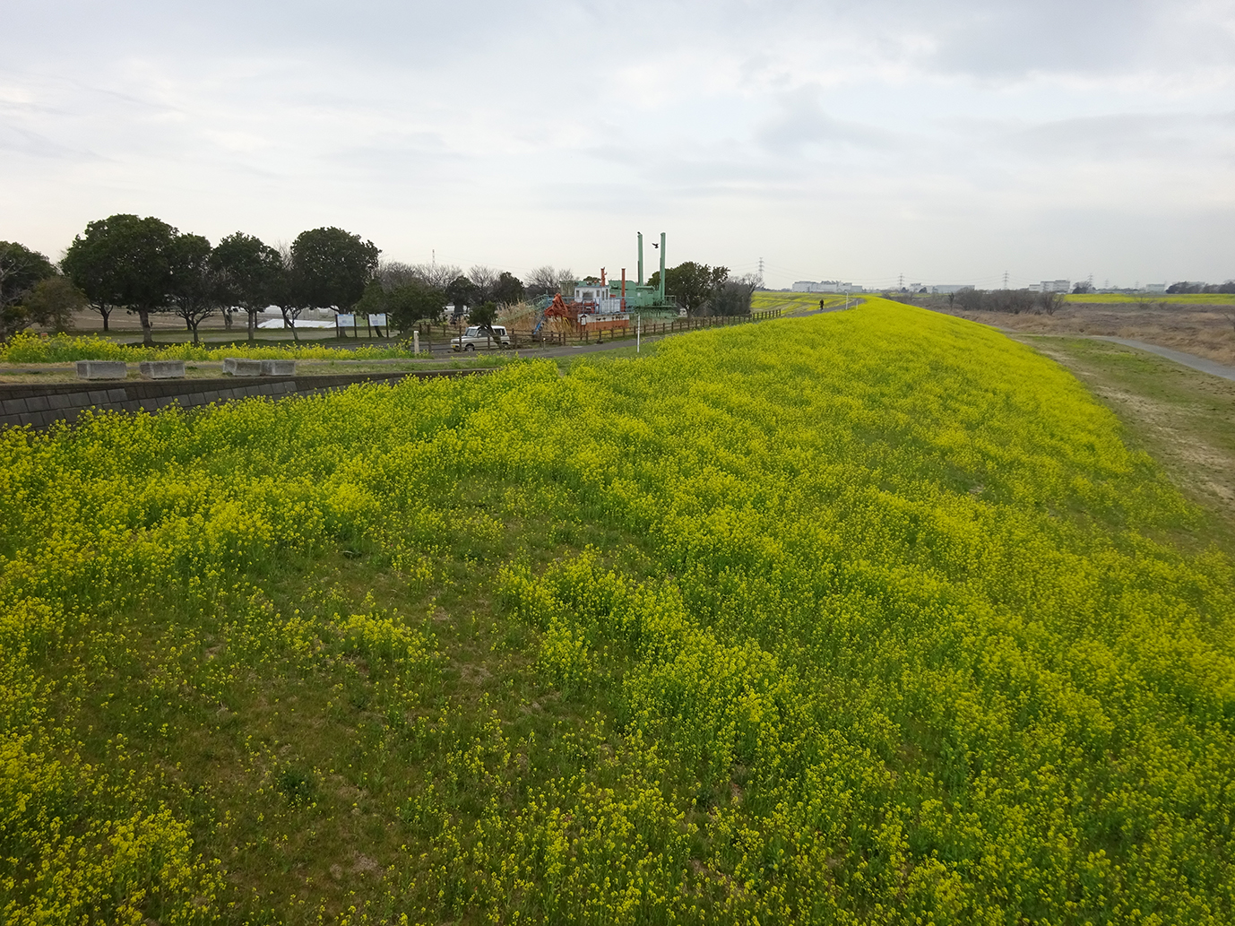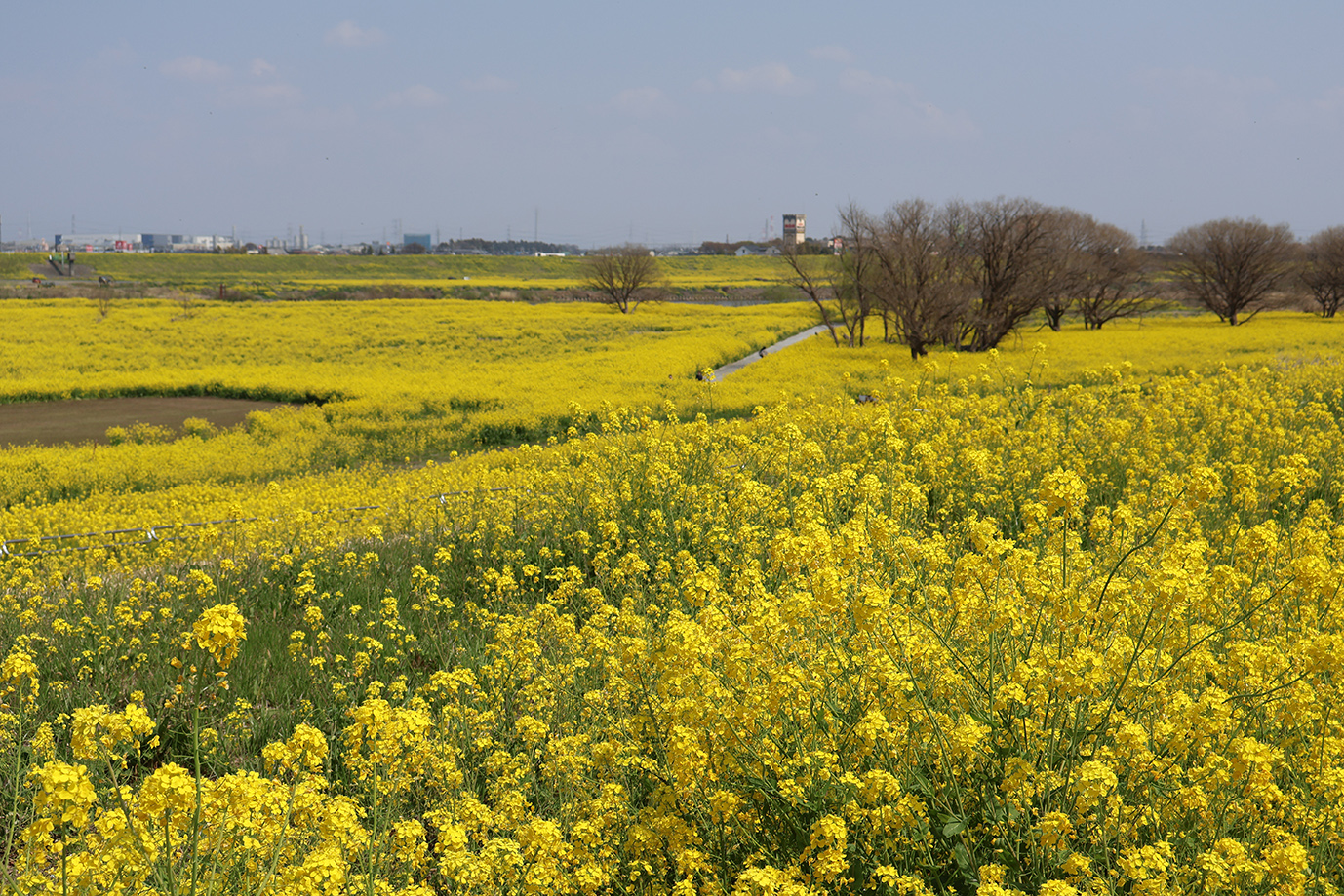 利根川沿いでは、菜の花が黄色い絨毯のように広がっています。 |