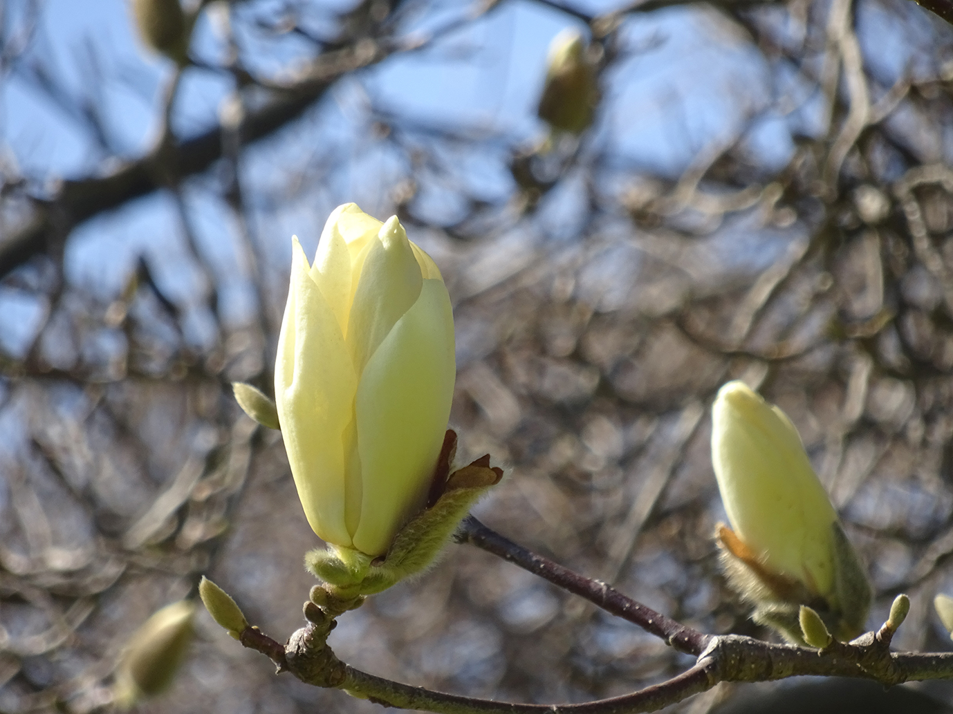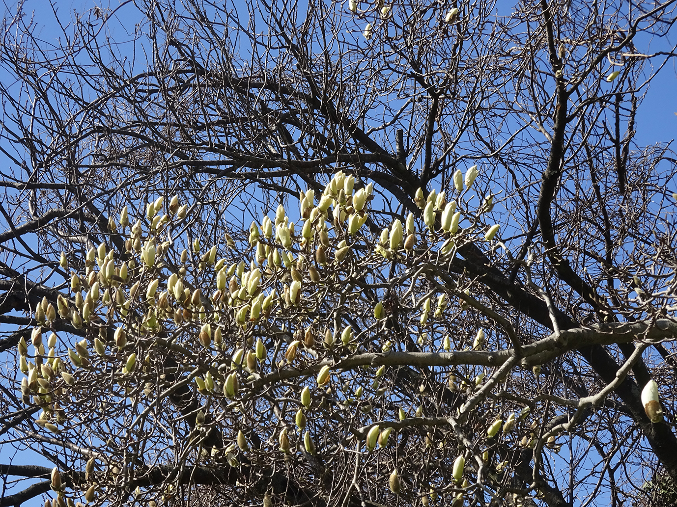 モクレンの木には、たくさんの蕾が‥。もうすぐ白く美しい花を見せてくれそうです。 |