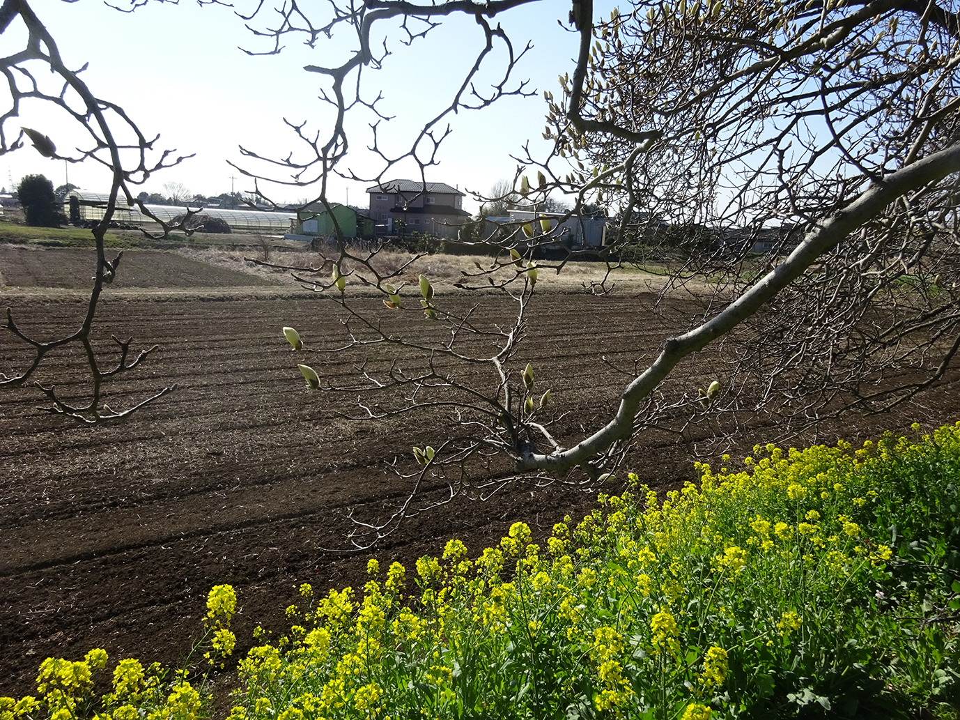モクレンの木の下には、色鮮やかな菜の花が、たくさん咲いていました。 |