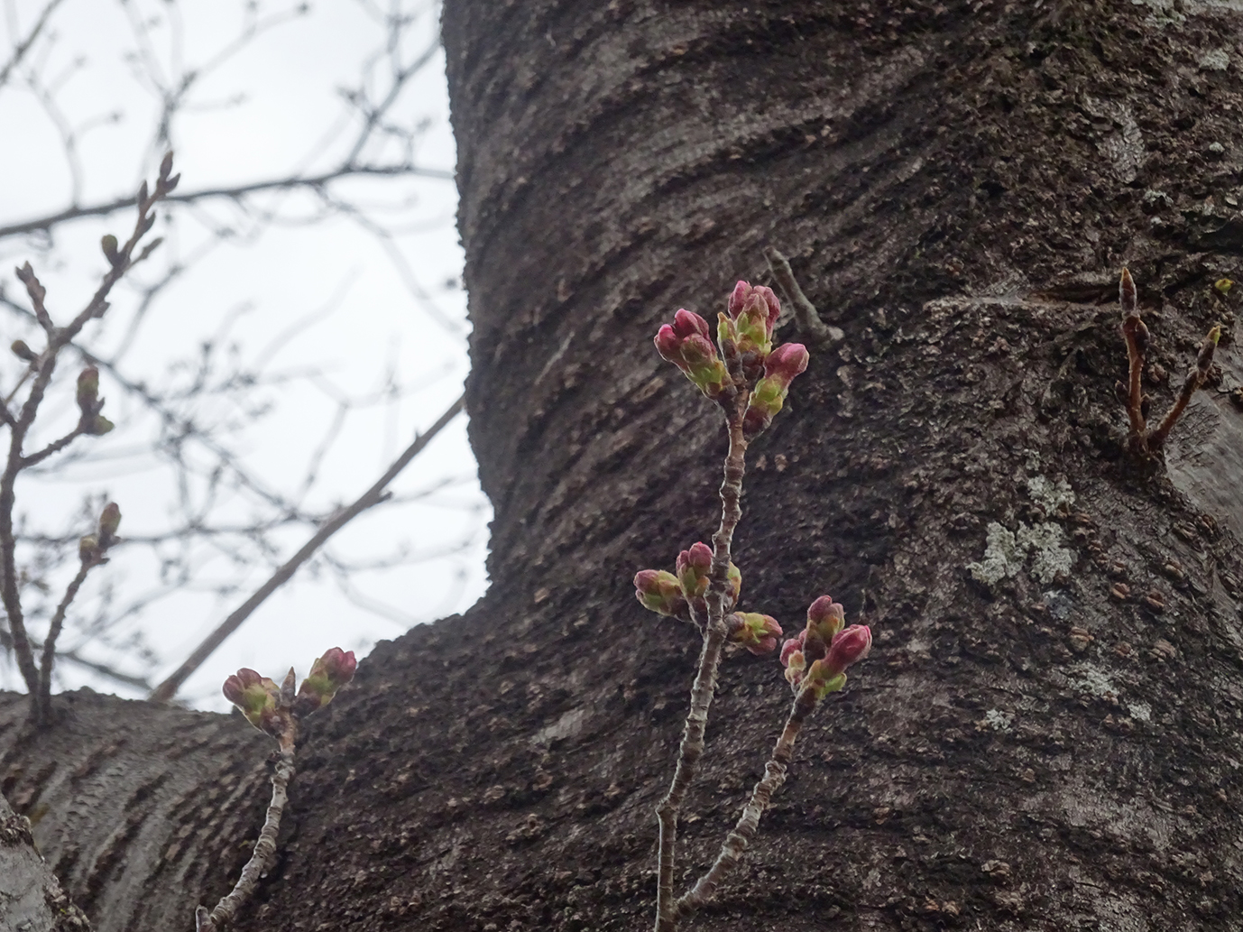 足元では水仙のつぼみが少し黄色味を帯び、ふっくらしてきました。