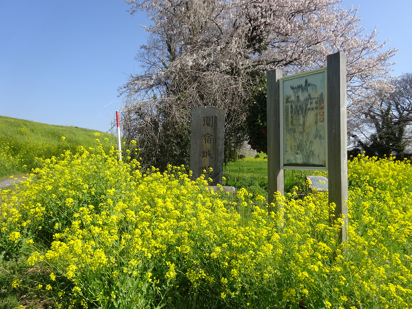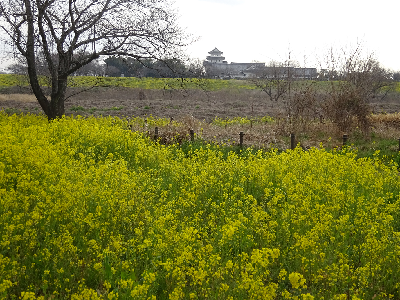 博物館から江戸川の堤防に沿って南に500m程下った関宿城の本丸跡では、菜の花と桜の花が花盛りです。 |