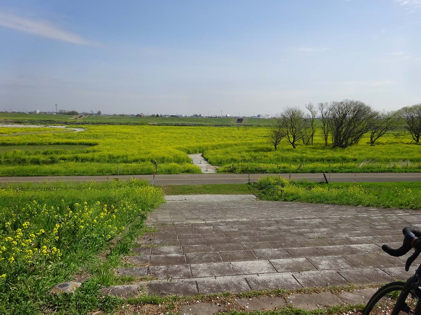 博物館裏の千葉県と茨城県の県境でも菜の花と桜の花が美しく、青空に映えています。 |