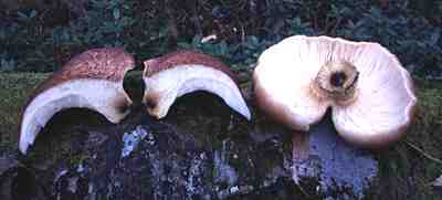 | キノコを割ったときに柄の根元付け根に黒い染みが あることが特徴。 高知県,工石山,1996.10.23 |