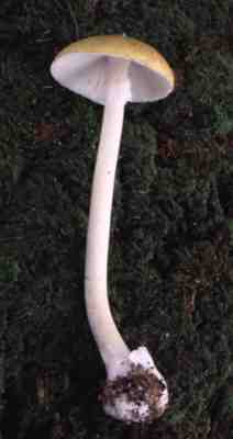 | Amanita subjunquillea ハラタケ目,テングタケ科, テングタケ属 プロフィール:黄色い可憐なきのこであるが猛毒である. 県内では,泉自然公園,市原市民の森,清澄等で発生が確認されている. 見分け方:キタマゴタケに類似するが、ひだが白色で傘に条線を欠く点,つぼが膨らみ上部が柄からやや遊離する点などで区別される. 発生時期と生態:やや稀なきのこで人里には少ないが,市原市民の森,清澄,清和県民の森などには時に発生する. 中毒のタイプ:A致命的な毒. 毒成分:アマトキシン系毒素で,下記の事故の場合患者の尿からα―アマニチンが検出されている. |