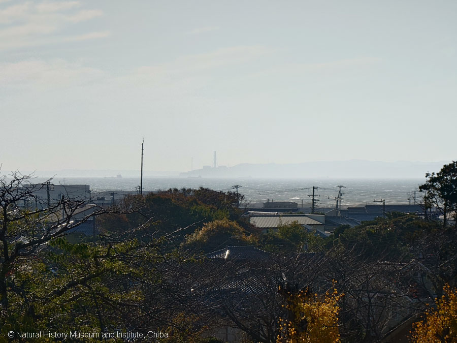 写真3 墳丘上からの眺め。対岸の三浦半島久里浜にある横須賀火力発電所の煙突が見える。