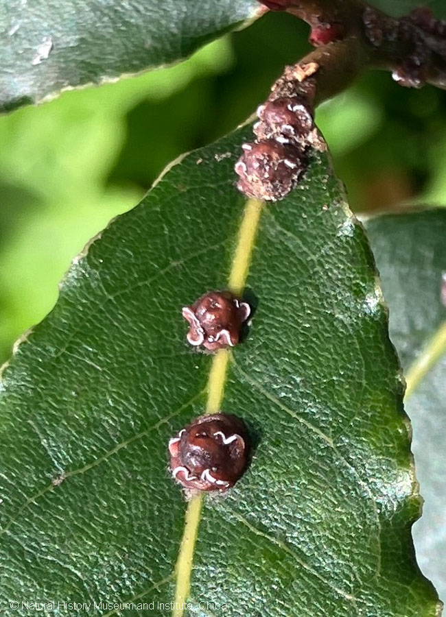 写真1 ゲッケイジュの葉の中脈上にならんだルビーロウカイガラムシ。